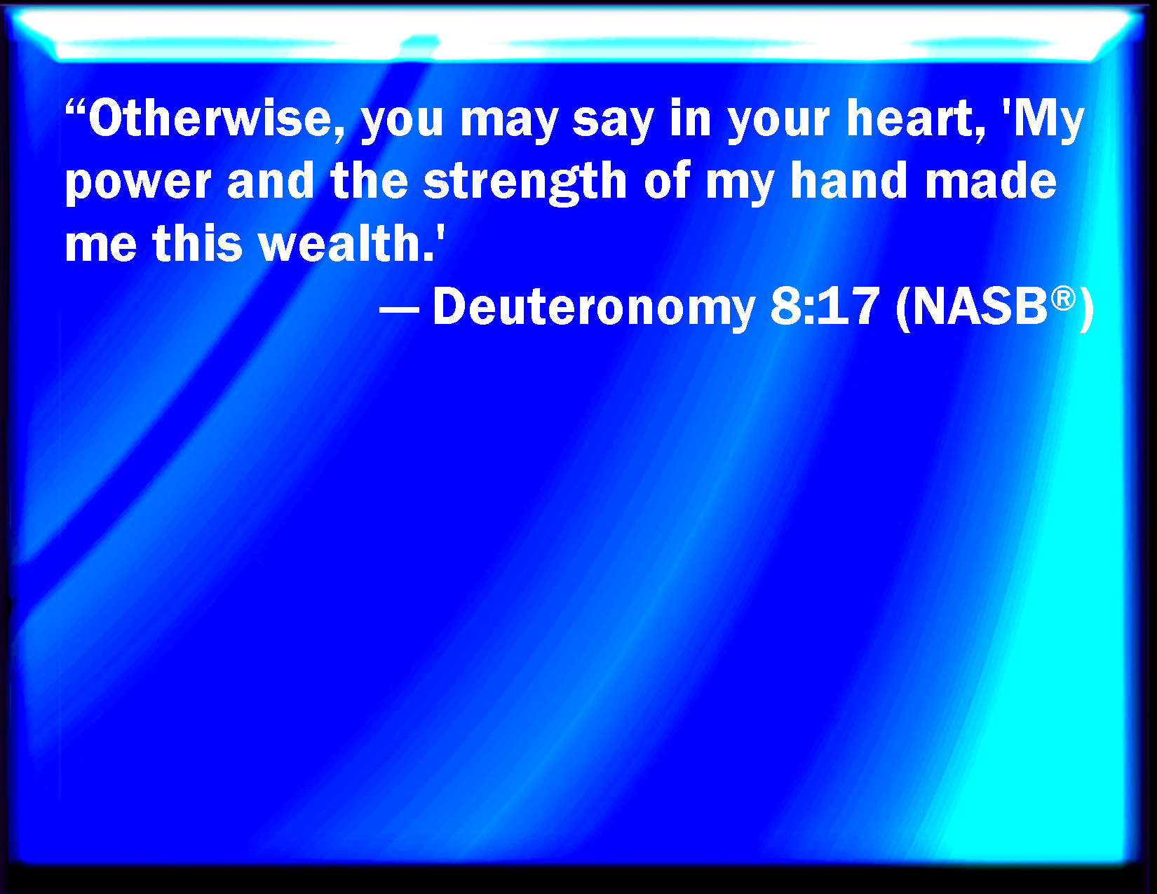 Bible Verse Slide Deuteronomy 8:17 And you say in your heart, My power and the might of my hand has gotten me this wealth. KJV: And thou say in thine heart, My power and the might of mine hand hath gotten me this wealth. DRB: Lest thou shouldst say in thy heart: My own might, and the strength of my own hand have achieved all these things for me. DBT: And thou say in thy heart, my power And the might of my hand has procured me This wealth. ERV: and thou say in thine heart, My power and the might of mine hand hath gotten me this wealth. WBT: And thou shalt say in thy heart, My power and the might of my hand hath gotten me this wealth. WEB: and [lest] you say in your heart, "My power and the might of my hand has gotten me this wealth." YLT: and thou hast said in thy heart, My power, and the might of my hand, hath made for me this wealth:Links Deuteronomy 8:17 NIV • Deuteronomy 8:17 NLT • Deuteronomy 8:17 ESV • Deuteronomy 8:17 NASB • Deuteronomy 8:17 KJV • Deuteronomy 8:17 Interlinear • Deuteronomy 8:17 Commentaries • Deuteronomy 8:17 Parallel Texts • Deuteronomy 8:17 Bible Apps • Deuteronomy 8:17 Parallel • Bible Hub |