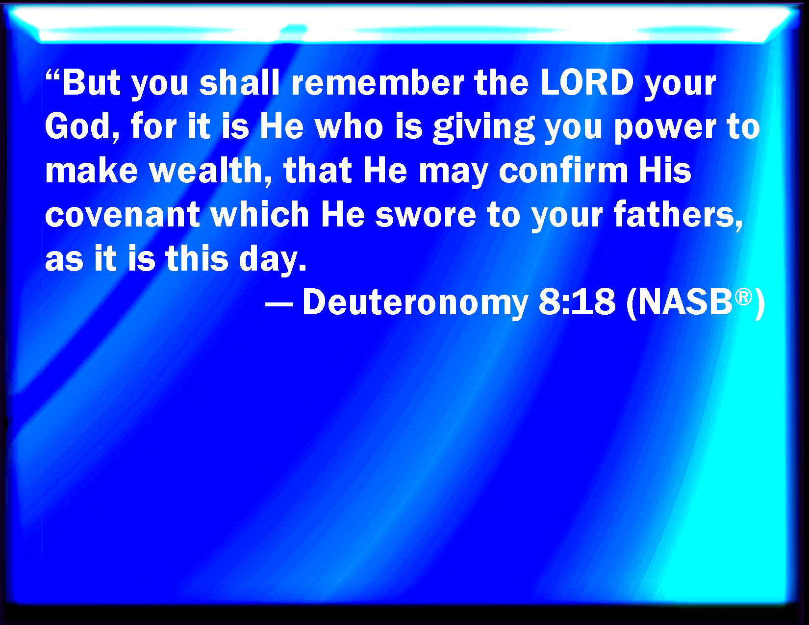 Bible Verse Slide Deuteronomy 8:18 But you shall remember the LORD your God: for it is he that gives you power to get wealth, that he may establish his covenant which he swore to your fathers, as it is this day. KJV: But thou shalt remember the LORD thy God: for it is he that giveth thee power to get wealth, that he may establish his covenant which he sware unto thy fathers, as it is this day. DRB: But remember the Lord thy God, that he hath given thee strength, that he might fulfil his covenant, concerning which he swore to thy fathers, as this present day sheweth. DBT: But thou shalt remember Jehovah thy God, that it is he who giveth thee power to get wealth, that he may establish his covenant which he swore unto thy fathers, as it is this day. ERV: But thou shalt remember the LORD thy God, for it is he that giveth thee power to get wealth; that he may establish his covenant which he sware unto thy fathers, as at this day. WBT: But thou shalt remember the LORD thy God: for it is he that giveth thee power to get wealth, that he may establish his covenant which he swore to thy fathers, as it is this day. WEB: But you shall remember Yahweh your God, for it is he who gives you power to get wealth; that he may establish his covenant which he swore to your fathers, as at this day. YLT: And thou hast remembered Jehovah thy God, for He it is who is giving to thee power to make wealth, in order to establish His covenant which He hath sworn to thy fathers as at this day.Links Deuteronomy 8:18 NIV • Deuteronomy 8:18 NLT • Deuteronomy 8:18 ESV • Deuteronomy 8:18 NASB • Deuteronomy 8:18 KJV • Deuteronomy 8:18 Interlinear • Deuteronomy 8:18 Commentaries • Deuteronomy 8:18 Parallel Texts • Deuteronomy 8:18 Bible Apps • Deuteronomy 8:18 Parallel • Bible Hub |