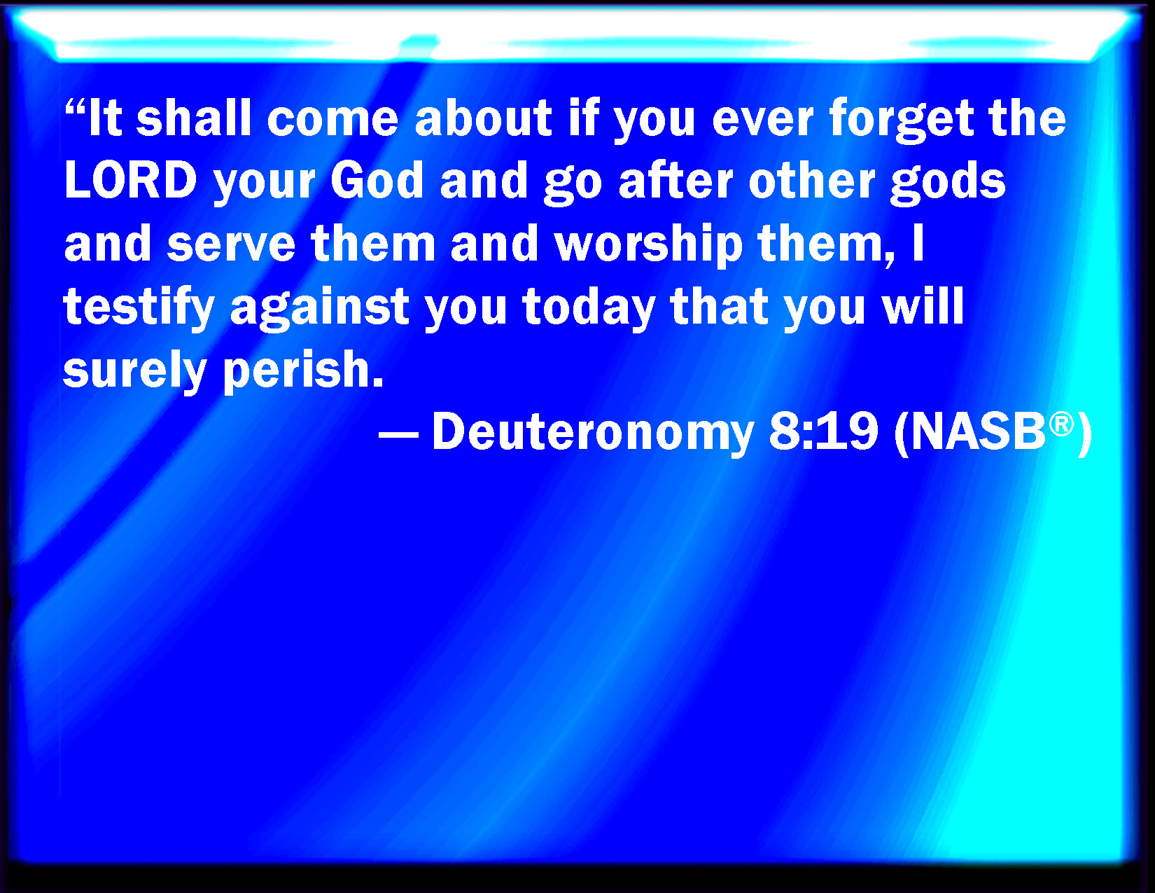 Bible Verse Slide Deuteronomy 8:19 And it shall be, if you do at all forget the LORD your God, and walk after other gods, and serve them, and worship them, I testify against you this day that you shall surely perish. KJV: And it shall be, if thou do at all forget the LORD thy God, and walk after other gods, and serve them, and worship them, I testify against you this day that ye shall surely perish. DRB: But if thou forget the Lord thy God, and follow strange gods, and serve and adore them: behold now I foretell thee that thou shalt utterly perish. DBT: And it shall be, if thou do at all forget Jehovah thy God, and go after other gods, and serve them, and bow down to them, I testify against you this day that ye shall utterly perish. ERV: And it shall be, if thou shalt forget the LORD thy God, and walk after other gods, and serve them, and worship them, I testify against you this day that ye shall surely perish. WBT: And it shall be, if thou shalt at all forget the LORD thy God, and walk after other gods, and serve them, and worship them, I testify against you this day that ye shall surely perish. WEB: It shall be, if you shall forget Yahweh your God, and walk after other gods, and serve them, and worship them, I testify against you this day that you shall surely perish. YLT: And it hath been — if thou really forget Jehovah thy God, and hast gone after other gods, and served them, and bowed thyself to them, I have testified against you to-day that ye do utterly perish;Links Deuteronomy 8:19 NIV • Deuteronomy 8:19 NLT • Deuteronomy 8:19 ESV • Deuteronomy 8:19 NASB • Deuteronomy 8:19 KJV • Deuteronomy 8:19 Interlinear • Deuteronomy 8:19 Commentaries • Deuteronomy 8:19 Parallel Texts • Deuteronomy 8:19 Bible Apps • Deuteronomy 8:19 Parallel • Bible Hub |