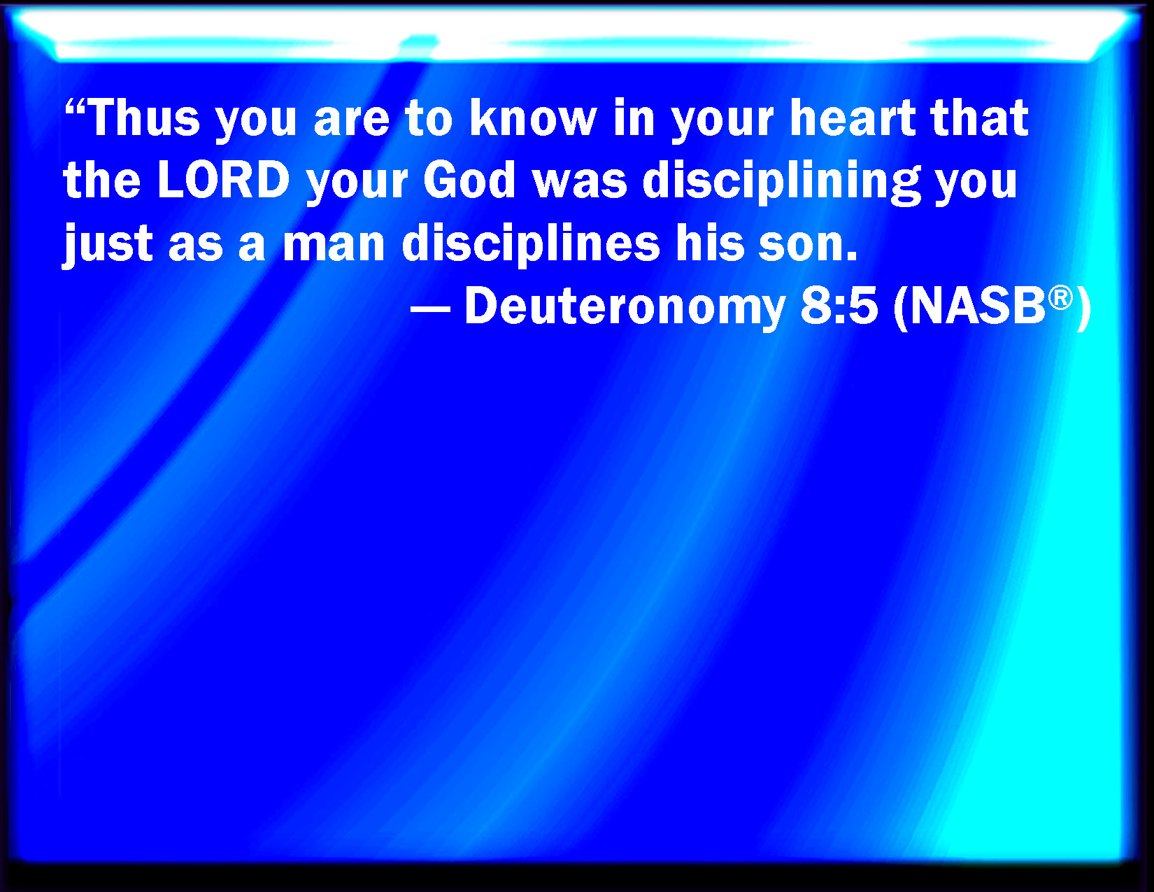 Bible Verse Slide Deuteronomy 8:5 You shall also consider in your heart, that, as a man chastens his son, so the LORD your God chastens you. KJV: Thou shalt also consider in thine heart, that, as a man chasteneth his son, so the LORD thy God chasteneth thee. DRB: That thou mayst consider in thy heart, that as a man traineth up his son, so the Lord thy God hath trained thee up. DBT: And know in thy heart that, as a man chasteneth his son, so Jehovah thy God chasteneth thee; ERV: And thou shalt consider in thine heart, that, as a man chasteneth his son, so the LORD thy God chasteneth thee. WBT: Thou shalt also consider in thy heart, that as a man chasteneth his son, so the LORD thy God chasteneth thee. WEB: You shall consider in your heart that as a man chastens his son, so Yahweh your God chastens you. YLT: and thou hast known, with thy heart, that as a man chastiseth his son Jehovah thy God is chastising thee,Links Deuteronomy 8:5 NIV • Deuteronomy 8:5 NLT • Deuteronomy 8:5 ESV • Deuteronomy 8:5 NASB • Deuteronomy 8:5 KJV • Deuteronomy 8:5 Interlinear • Deuteronomy 8:5 Commentaries • Deuteronomy 8:5 Parallel Texts • Deuteronomy 8:5 Bible Apps • Deuteronomy 8:5 Parallel • Bible Hub |