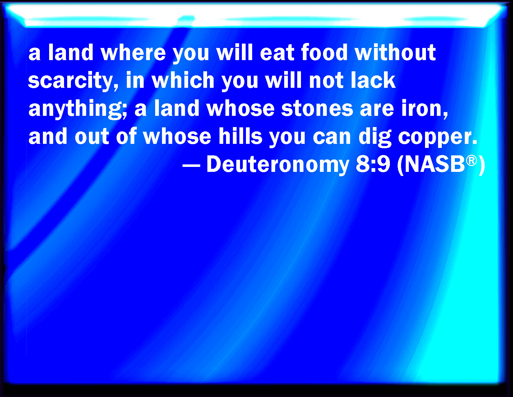 Bible Verse Slide Deuteronomy 8:9 A land wherein you shall eat bread without scarceness, you shall not lack any thing in it; a land whose stones are iron, and out of whose hills you may dig brass. KJV: A land wherein thou shalt eat bread without scarceness, thou shalt not lack any thing in it; a land whose stones are iron, and out of whose hills thou mayest dig brass. DRB: Where without any want thou shalt eat thy bread, and enjoy abundance of all things: where the stones are iron, and out of its hills are dug mines of brass: DBT: a land wherein thou shalt eat bread without scarceness, where thou shalt lack nothing; a land whose stones are iron, and out of whose mountains thou wilt dig copper. ERV: a land wherein thou shalt eat bread without scarceness, thou shalt not lack any thing in it; a land whose stones are iron, and out of whose hills thou mayest dig brass. WBT: A land in which thou shalt eat bread without scarceness, thou shalt not lack any thing in it, a land whose stones are iron, and out of whose hills thou mayest dig brass. WEB: a land in which you shall eat bread without scarceness, you shall not lack anything in it; a land whose stones are iron, and out of whose hills you may dig copper. YLT: a land in which without scarcity thou dost eat bread, thou dost not lack anything in it; a land whose stones are iron, and out of its mountains thou dost dig brass;Links Deuteronomy 8:9 NIV • Deuteronomy 8:9 NLT • Deuteronomy 8:9 ESV • Deuteronomy 8:9 NASB • Deuteronomy 8:9 KJV • Deuteronomy 8:9 Interlinear • Deuteronomy 8:9 Commentaries • Deuteronomy 8:9 Parallel Texts • Deuteronomy 8:9 Bible Apps • Deuteronomy 8:9 Parallel • Bible Hub |