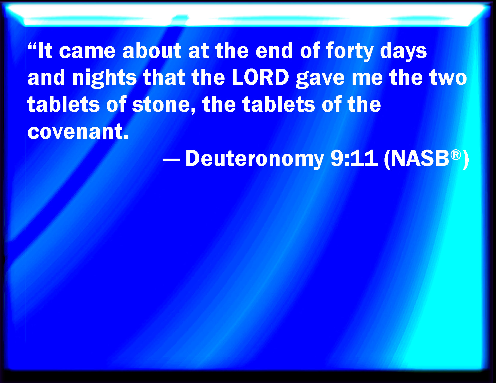 Bible Verse Slide Deuteronomy 9:11 And it came to pass at the end of forty days and forty nights, that the LORD gave me the two tables of stone, even the tables of the covenant. KJV: And it came to pass at the end of forty days and forty nights, that the LORD gave me the two tables of stone, even the tables of the covenant. DRB: And when forty days were passed, and as many nights, the Lord gave me the two tables of stone, the tables of the covenant, DBT: And it came to pass at the end of forty days and forty nights, that Jehovah gave me the two tables of stone, the tables of the covenant. ERV: And it came to pass at the end of forty days and forty nights, that the LORD gave me the two tables of stone, even the tables of the covenant. WBT: And it came to pass at the end of forty days and forty nights, that the LORD gave me the two tables of stone, even the tables of the covenant. WEB: It came to pass at the end of forty days and forty nights, that Yahweh gave me the two tables of stone, even the tables of the covenant. YLT: And it cometh to pass, at the end of forty days and forty nights, Jehovah hath given unto me the two tables of stone — tables of the covenant,Links Deuteronomy 9:11 NIV • Deuteronomy 9:11 NLT • Deuteronomy 9:11 ESV • Deuteronomy 9:11 NASB • Deuteronomy 9:11 KJV • Deuteronomy 9:11 Interlinear • Deuteronomy 9:11 Commentaries • Deuteronomy 9:11 Parallel Texts • Deuteronomy 9:11 Bible Apps • Deuteronomy 9:11 Parallel • Bible Hub |