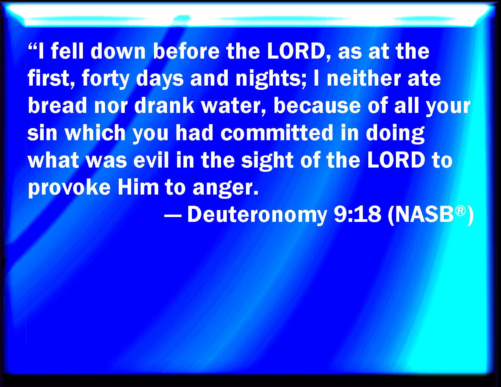 Bible Verse Slide Deuteronomy 9:18 And I fell down before the LORD, as at the first, forty days and forty nights: I did neither eat bread, nor drink water, because of all your sins which you sinned, in doing wickedly in the sight of the LORD, to provoke him to anger. KJV: And I fell down before the LORD, as at the first, forty days and forty nights: I did neither eat bread, nor drink water, because of all your sins which ye sinned, in doing wickedly in the sight of the LORD, to provoke him to anger. DRB: And I fell down before the Lord se before, forty days and nights neither eating bread, nor drinking water, for all your sins, which you had committed against the Lord, and had provoked him to wrath: DBT: And I fell down before Jehovah, as at the first, forty days and forty nights, I ate no bread and drank no water, because of all your sin which ye had sinned, in doing what is evil in the eyes of Jehovah, to provoke him to anger. ERV: And I fell down before the LORD, as at the first, forty days and forty nights; I did neither eat bread nor drink water; because of all your sin which ye sinned, in doing that which was evil in the sight of the LORD, to provoke him to anger. WBT: And I fell down before the LORD, as at the first, forty days and forty nights: I neither ate bread, nor drank water, because of all your sins which ye sinned, in doing wickedly in the sight of the LORD, to provoke him to anger. WEB: I fell down before Yahweh, as at the first, forty days and forty nights; I did neither eat bread nor drink water; because of all your sin which you sinned, in doing that which was evil in the sight of Yahweh, to provoke him to anger. YLT: and I throw myself before Jehovah, as at first, forty days and forty nights; bread I have not eaten, and water I have not drunk, because of all your sins which ye have sinned, by doing the evil thing in the eyes of Jehovah, to make Him angry.Links Deuteronomy 9:18 NIV • Deuteronomy 9:18 NLT • Deuteronomy 9:18 ESV • Deuteronomy 9:18 NASB • Deuteronomy 9:18 KJV • Deuteronomy 9:18 Interlinear • Deuteronomy 9:18 Commentaries • Deuteronomy 9:18 Parallel Texts • Deuteronomy 9:18 Bible Apps • Deuteronomy 9:18 Parallel • Bible Hub |