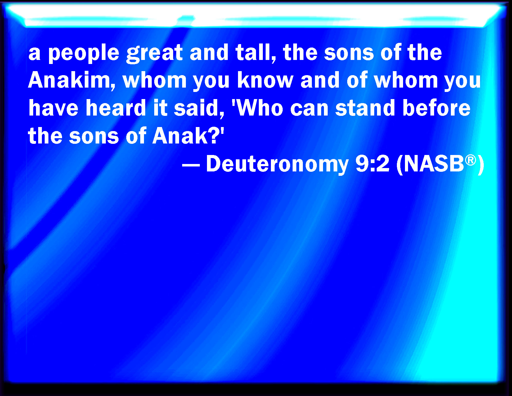 WBT:  A people great and tall, the children of the Anakims, whom thou knowest, and of whom thou hast heard it said, Who can stand before the children of Anak!