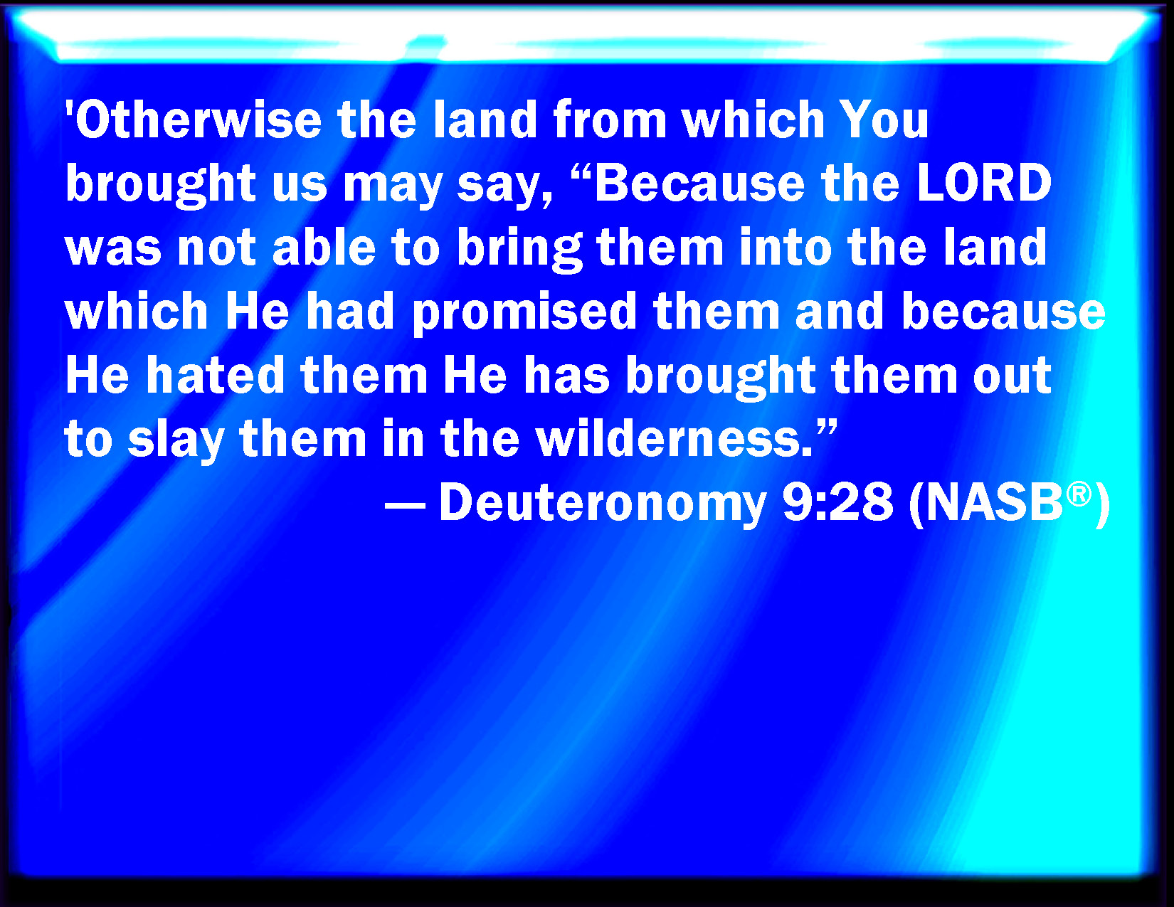 Bible Verse Slide Deuteronomy 9:28 Lest the land from where you brought us out say, Because the LORD was not able to bring them into the land which he promised them, and because he hated them, he has brought them out to slay them in the wilderness. KJV: Lest the land whence thou broughtest us out say, Because the LORD was not able to bring them into the land which he promised them, and because he hated them, he hath brought them out to slay them in the wilderness. DRB: Lest perhaps the inhabitants of the land, out of which thou hast brought us, say: The Lord could not bring them into the land that he promised them, and he hated them: therefore he brought them out, that he might kill them in the wilderness, DBT: lest the land whence thou broughtest us out say, Because Jehovah was not able to bring them into the land which he had promised them, and because he hated them, he hath brought them out to kill them in the wilderness. ERV: lest the land whence thou broughtest us out say, Because the LORD was not able to bring them into the land which he promised unto them, and because he hated them, he hath brought them out to slay them in the wilderness. WBT: Lest the land from which thou hast brought us should say, Because the LORD was not able to bring them into the land which he promised them, and because he hated them, he hath brought them out to slay them in the wilderness. WEB: lest the land you brought us out from say, 'Because Yahweh was not able to bring them into the land which he promised to them, and because he hated them, he has brought them out to kill them in the wilderness.' YLT: lest the land say from which Thou hast brought us out, Because of Jehovah's want of ability to bring them in unto the land of which He hath spoken to them, and because of His hating them, He brought them out to put them to death in the wilderness;Links Deuteronomy 9:28 NIV • Deuteronomy 9:28 NLT • Deuteronomy 9:28 ESV • Deuteronomy 9:28 NASB • Deuteronomy 9:28 KJV • Deuteronomy 9:28 Interlinear • Deuteronomy 9:28 Commentaries • Deuteronomy 9:28 Parallel Texts • Deuteronomy 9:28 Bible Apps • Deuteronomy 9:28 Parallel • Bible Hub |