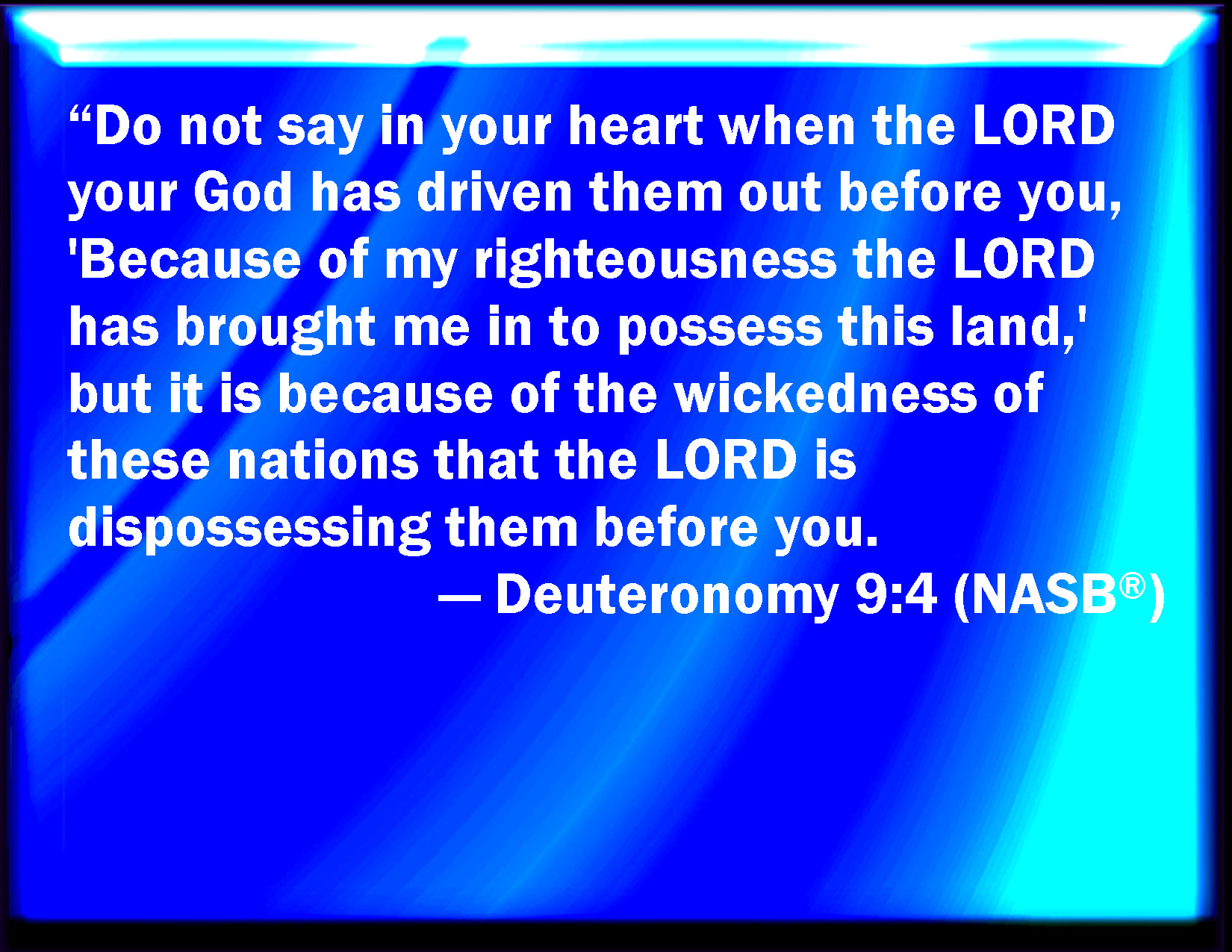 Bible Verse Slide Deuteronomy 9:4 Speak not you in your heart, after that the LORD your God has cast them out from before you, saying, For my righteousness the LORD has brought me in to possess this land: but for the wickedness of these nations the LORD does drive them out from before you. KJV: Speak not thou in thine heart, after that the LORD thy God hath cast them out from before thee, saying, For my righteousness the LORD hath brought me in to possess this land: but for the wickedness of these nations the LORD doth drive them out from before thee. DRB: Say not in thy heart, when the Lord thy God shall have destroyed them in thy sight: For my justice hath the Lord brought me in to possess this land, whereas these nations are destroyed for their wickedness. DBT: Thou shalt not say in thy heart, when Jehovah thy God thrusteth them out from before thee, saying, For my righteousness Jehovah hath brought me in to possess this land; but for the wickedness of these nations doth Jehovah dispossess them from before thee. ERV: Speak not thou in thine heart, after that the LORD thy God hath thrust them out from before thee, saying, For my righteousness the LORD hath brought me in to possess this land: whereas for the wickedness of these nations the LORD doth drive them out from before thee. WBT: Speak not thou in thy heart, after that the LORD thy God hath cast them out from before thee, saying, For my righteousness the LORD hath brought me in to possess this land: but for the wickedness of these nations the LORD doth drive them out from before thee. WEB: Don't say in your heart, after Yahweh your God has thrust them out from before you, saying, "For my righteousness Yahweh has brought me in to possess this land;" because Yahweh drives them out before you because of the wickedness of these nations. YLT: 'Thou dost not speak in thy heart (in Jehovah thy God's driving them away from before thee), saying, For my righteousness hath Jehovah brought me in to possess this land, seeing for the wickedness of these nations is Jehovah dispossessing them from thy presence;Links Deuteronomy 9:4 NIV • Deuteronomy 9:4 NLT • Deuteronomy 9:4 ESV • Deuteronomy 9:4 NASB • Deuteronomy 9:4 KJV • Deuteronomy 9:4 Interlinear • Deuteronomy 9:4 Commentaries • Deuteronomy 9:4 Parallel Texts • Deuteronomy 9:4 Bible Apps • Deuteronomy 9:4 Parallel • Bible Hub |